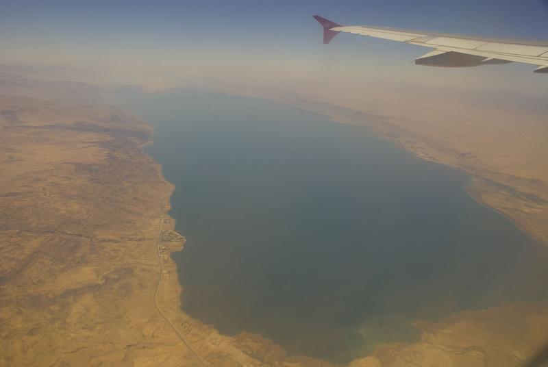 vista del mar muerto desde el avion, a la vuelta, a la izquierda jordania, a la derecha israel y los territorios palestinos, jordania, agosto 2007