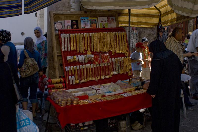 puesto de oro en el zoco de damasco, siria, agosto 2007