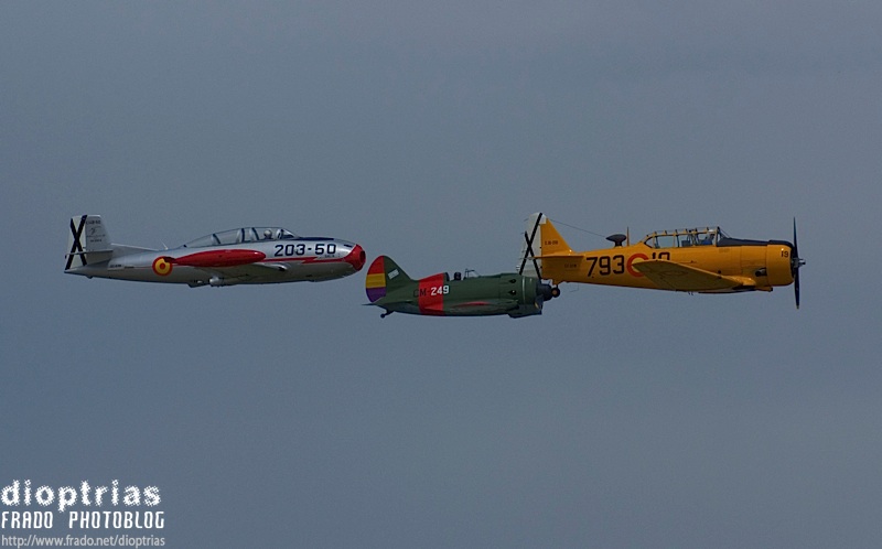 un hispano ha-200 saeta, un polikarpov i-16 y un north american t-6 texan volando en formación durante la presentación del polikarpov i-16 mosca/rata por la fundación infante de orleans, cuatrovientos, madrid, 4 de mayo de 2008