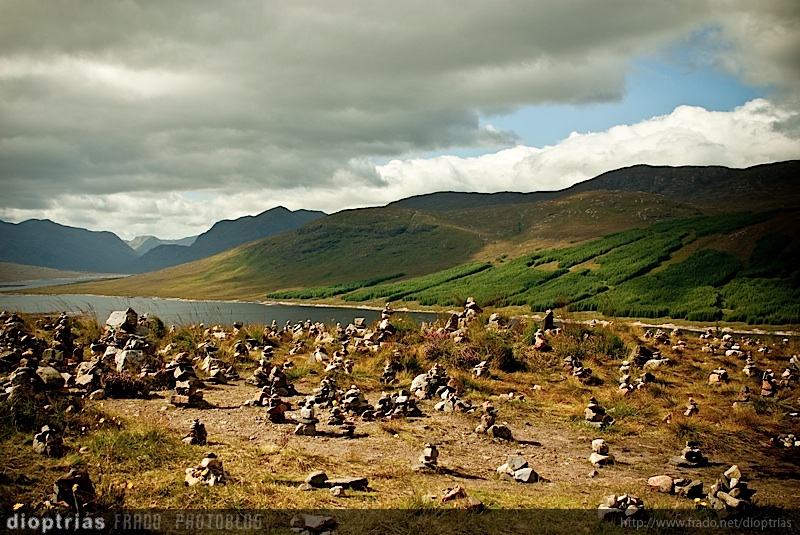 curioso lugar con montones de piedras unas sobre otras, cerca del loch loine, escocia, agosto de 2010