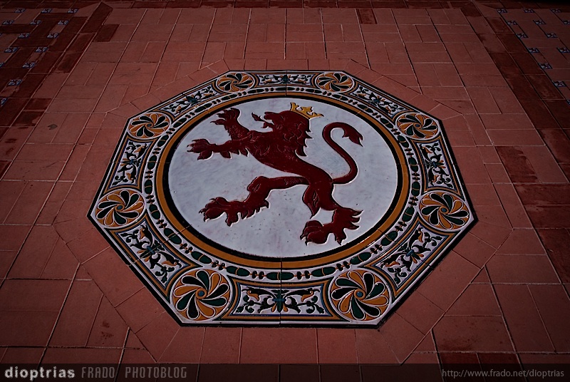 azulejos con el escudo del reino de león y plaza españa, sevilla, diciembre de 2010