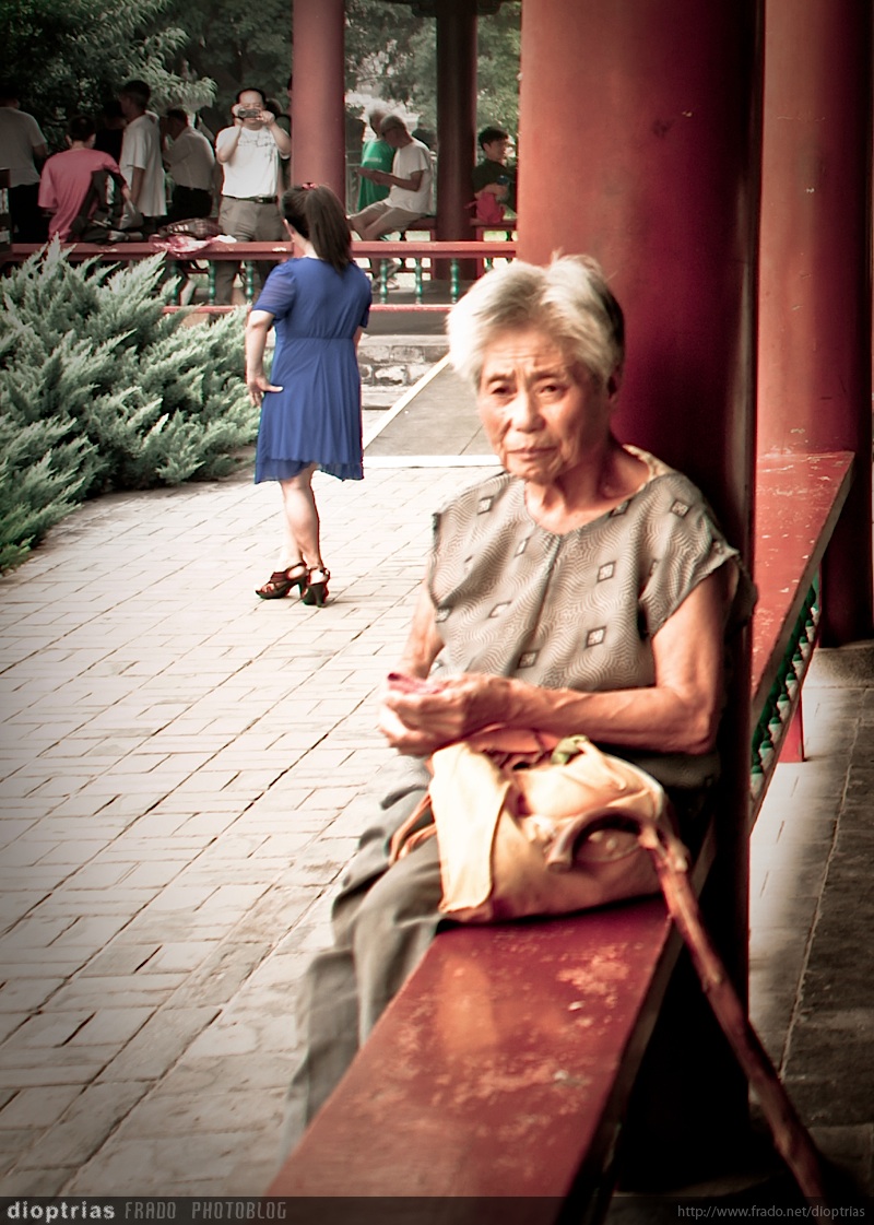 anciana esperando en el templo del cielo, beijing, china, agosto de 2011
