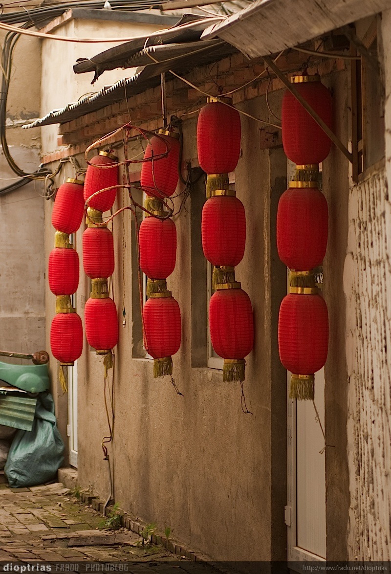 farolillos en un hutong, beijing, china, agosto de 2011
